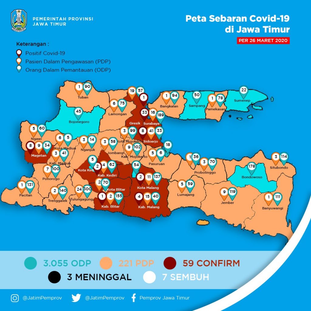 Peta Sebaran Covid-19 di Jawa Timur Per 26 Maret 2020 Posted on March 26, 2020March 27, 2020 by Dinas Komunikasi dan Informatika